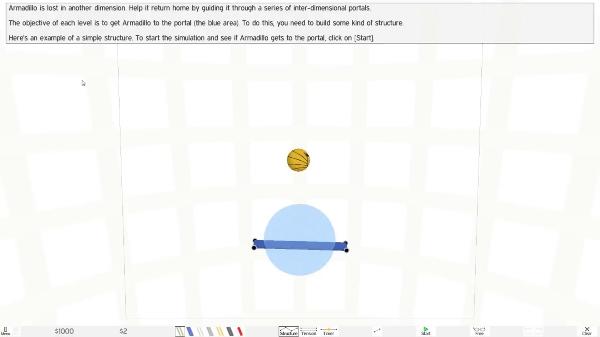 Armadillo Run is a physics-based puzzle game. You have to build structures with the purpose of getting an armadillo to a certain point in space. There is a selection of building materials, each with different properties, which can be combined to form almost anything. The realistic physics simulation gives you the freedom to solve each level in many different ways.